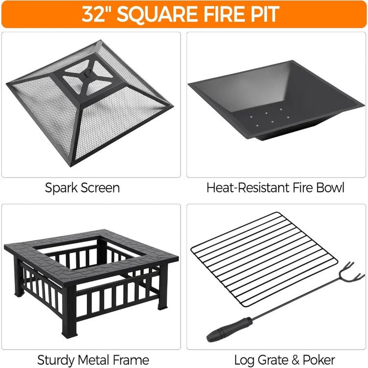 Fire Pit Table 32in Square Metal Firepit Stove Backyard Patio Garden Fireplace for Camping, Outdoor Heating, Bonfire and Picnic