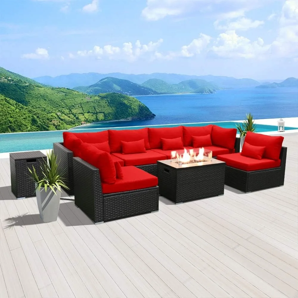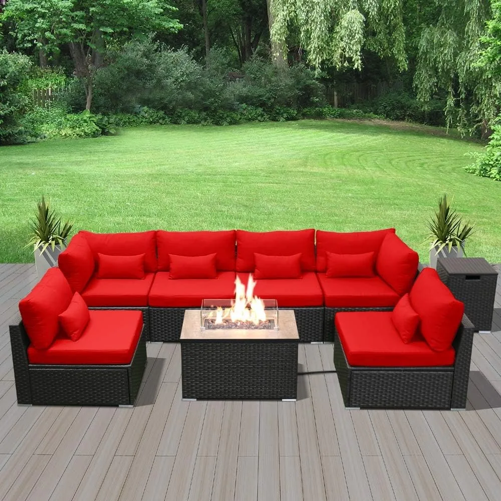 Furniture Sectional Sofa with Gas Fire Pit Table Outdoor Patio Furniture Sets Propane Fire Pit red-Rectangular Garden Sofas