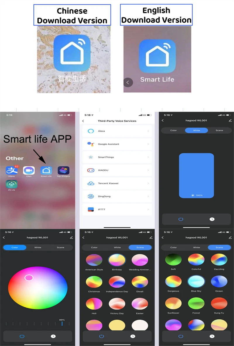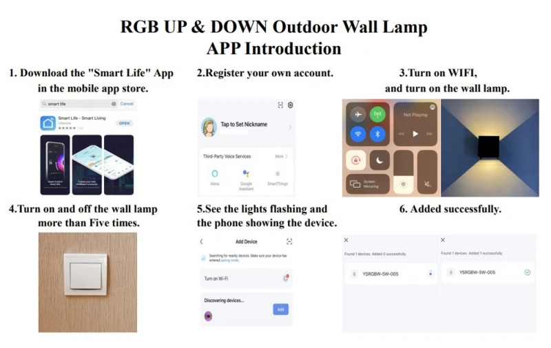 Download the ''smart life'' app — register an account — turn on wifi — ''on/off'' power for 5 times — see warm light breathing — add equipment — complete